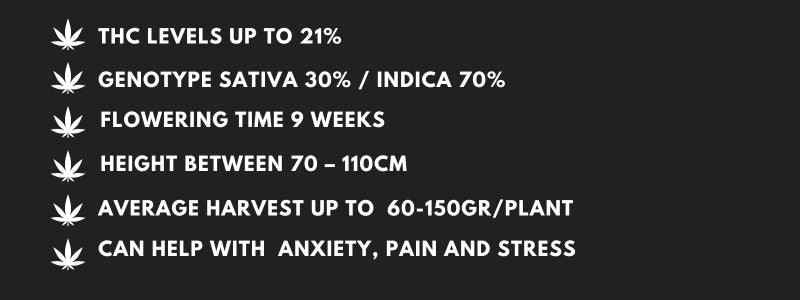 Her THC levels can range up to 21% making this hybrid potent, fast to grow, and highly desirable when it comes to smell, taste, and effect. Strongly recommended for hash making, due to the great flavor profile
